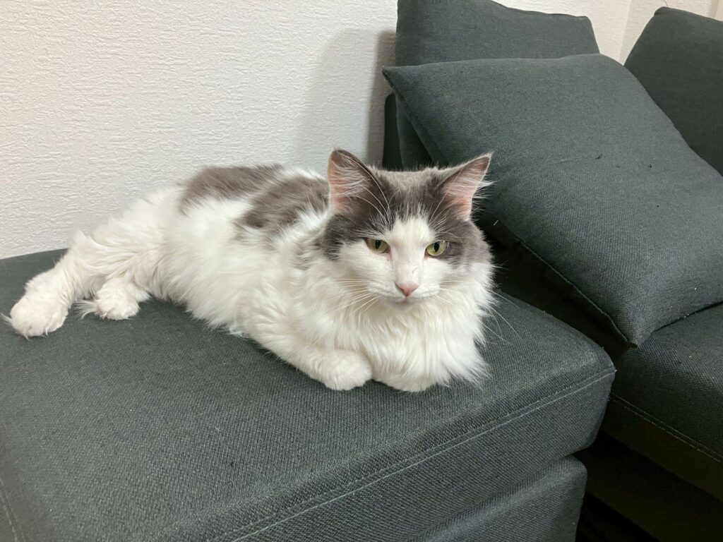 とろろは、4歳になる女の子です。お腹が白くて背中がグレー、体重も5〜6kgと大柄で、見た目はラグドールそっくり。鼻の頭にある傷がチャームポイントで、とても人懐っこい性格です。実は私たちには、ある習慣がありました。