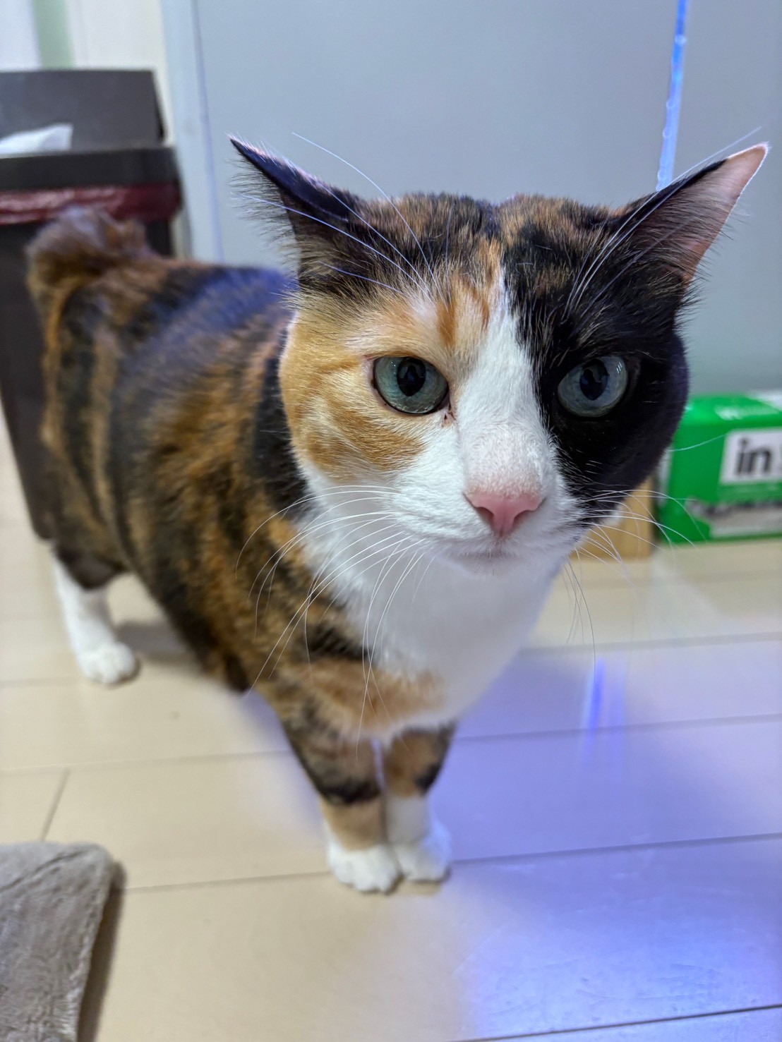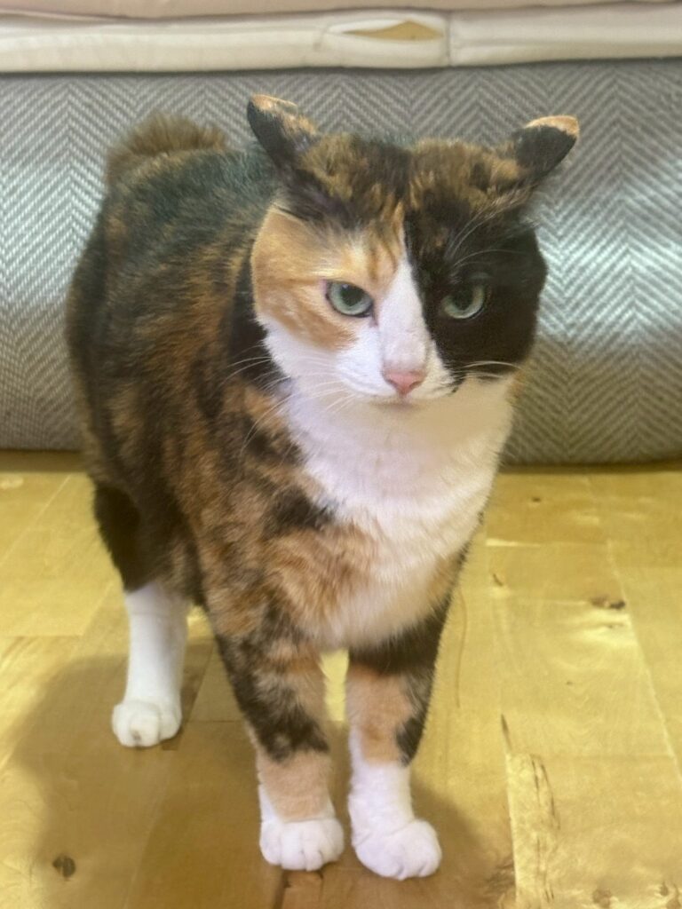 つくねは、9歳になる三毛猫の女の子です。体重6キロと少しぽっちゃりした体型ですが、性格は非常に臆病で警戒心が強い子です。ある日の夜7時、2階のベランダから不意に脱走してしまいました。